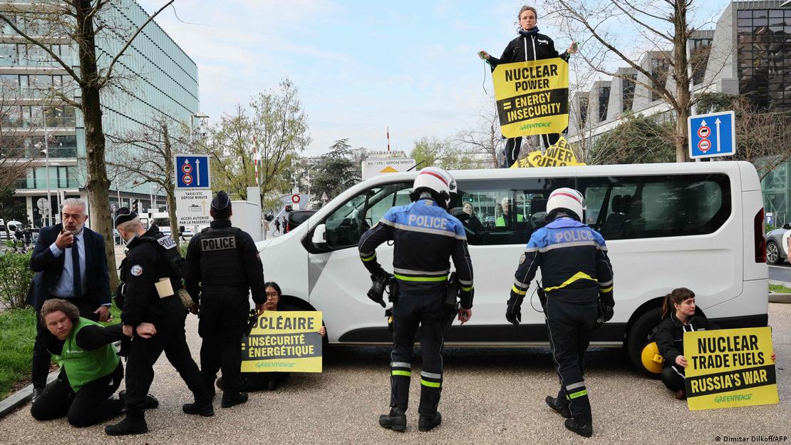 抗议者高举横幅,上写"核电等于能源不安全"和"核电助长俄罗斯战争"。