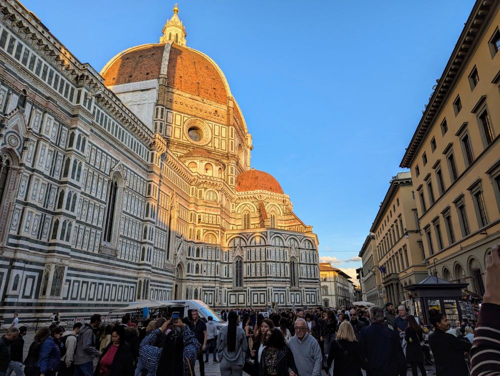 这是我们第二次去佛罗伦萨,所以我们比较熟悉了。到了佛罗伦萨后,我们就直奔圣马可广场看日落。这里的日落是不可错过的。我们到的时候,很多人已经在那里等着。佛罗伦萨的日落着实令人心醉,每次都不会失望。太阳下山的时候,文艺复兴建筑沐浴在金色之中,给这座中世纪城市增添了不可抵挡的魅力。这次圣马可广场还搭了一个看台,供人坐着看日落。