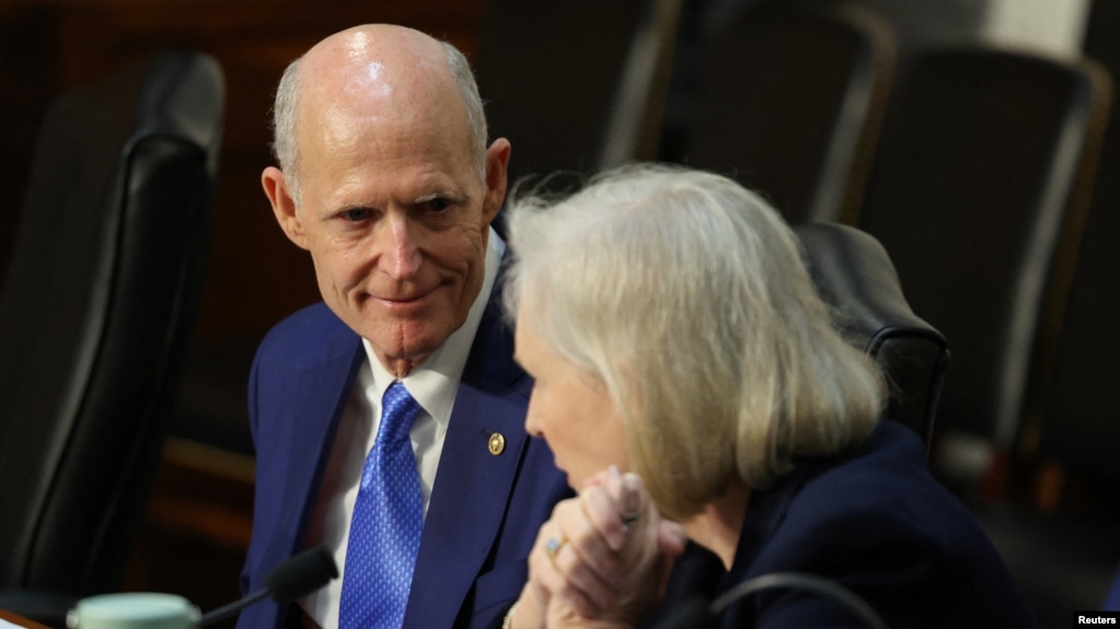 资料照片:美国参议院老龄问题特别委员会在华盛顿特区举行一场听证会期间,佛罗里达州的共和党籍参议员里克·斯科特与纽约州的民主党籍参议员柯尔斯滕·吉利布兰德进行交谈。(2025年10月22日)