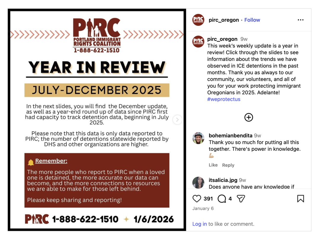 与华州类似,俄勒冈州的执法增长主要集中在2025年最后三个月。数据显示,2025年前九个月每月逮捕人数通常不足100人,但10月至12月每月均突破300起,其中10月和11月甚至超过400起。摩特诺玛县(MultnomahCounty),也就是波特兰大部分地区所在县,全年记录约770起逮捕,而2024年仅为180起。