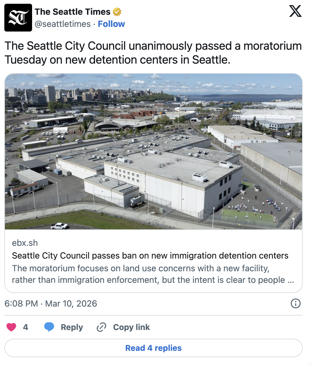 西雅图市议会在周二(10日)一致通过了一项暂停新建拘留中心的法令,旨在预先制止一切可能用于关押移民执法机构所抓捕人员的新设施建设——即便这些设施目前仅处于假设阶段。
