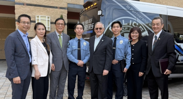南加州华裔社区青少年近日完成一项公益行动。在两位尔湾华裔双胞胎兄弟张梦泽(David Chang)与张梦熊(Daniel Chang)的发起与号召下,多位华裔青少年经过持续募款努力,成功捐赠一辆价值约10万美元的箱型警车给尔湾警局(Irvine Police Department)少年警员计划(Explorer Program),为少警队训练与执勤提供重要支援。