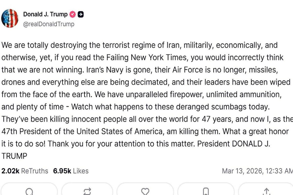 英国广播公司(BBC)指出,川普(Donald Trump)13日在社交媒体“真实社群”(Truth Social)发文,表示美方“正透过军事、经济与其他手段,铲除伊朗恐怖分子政权”。