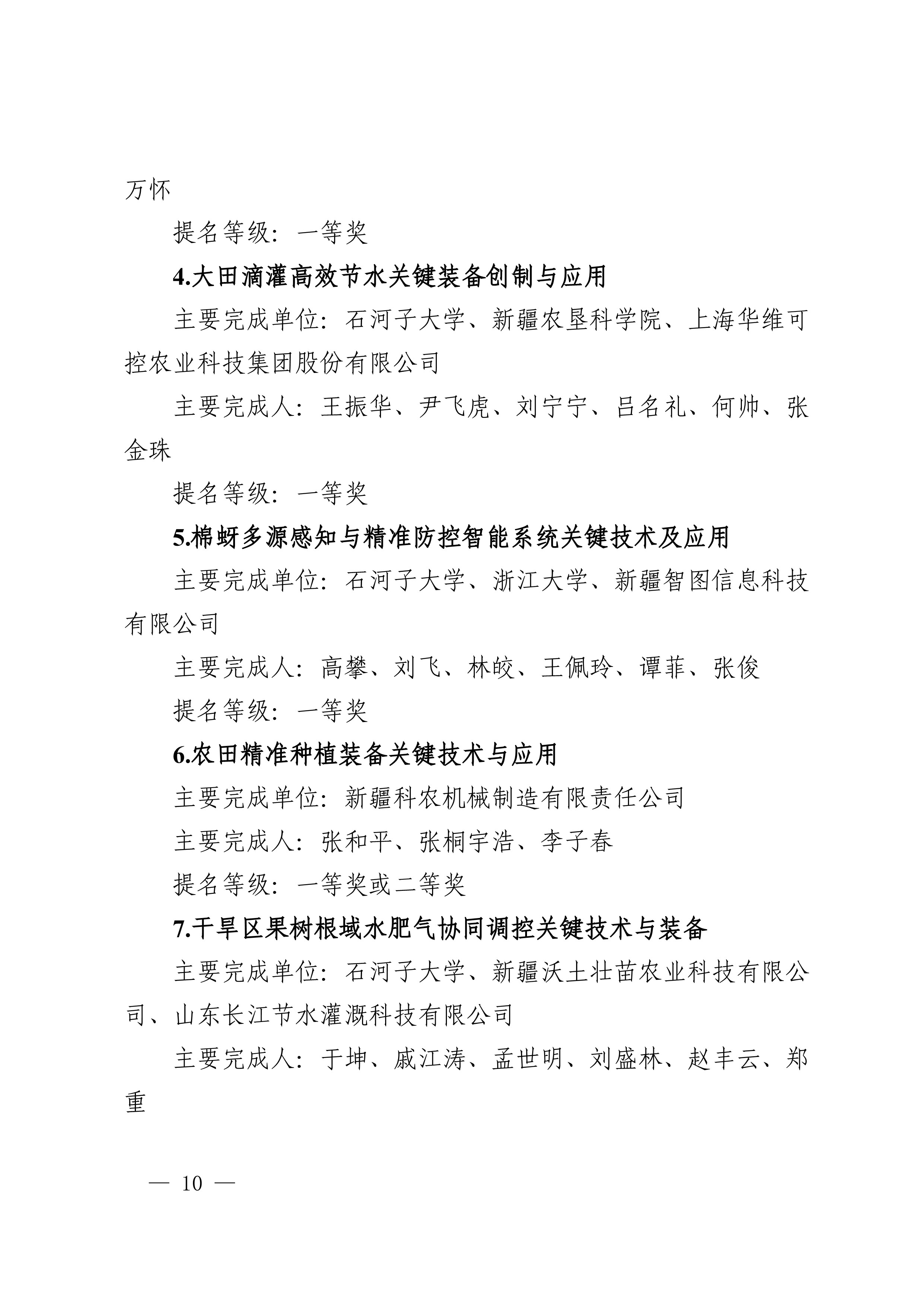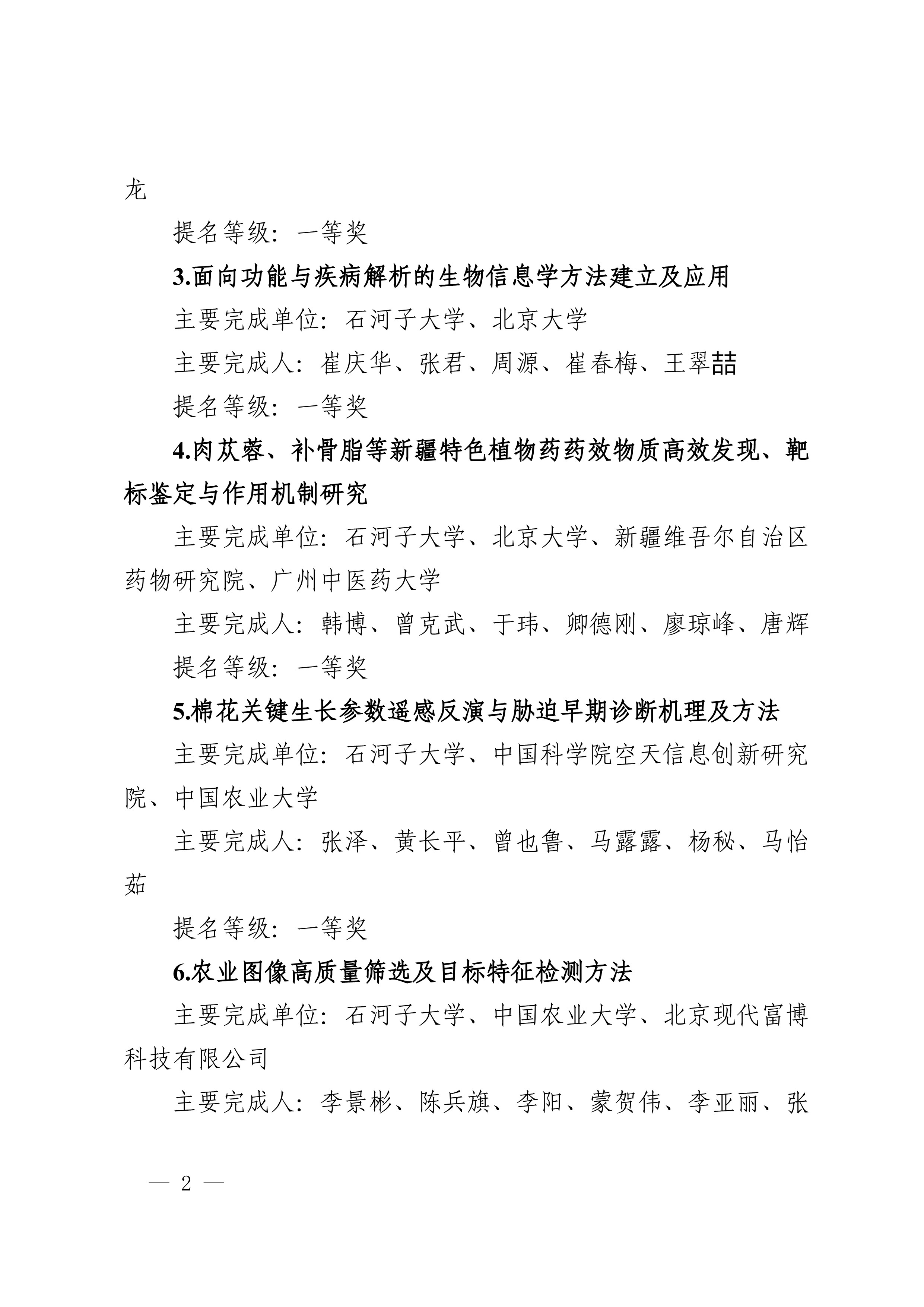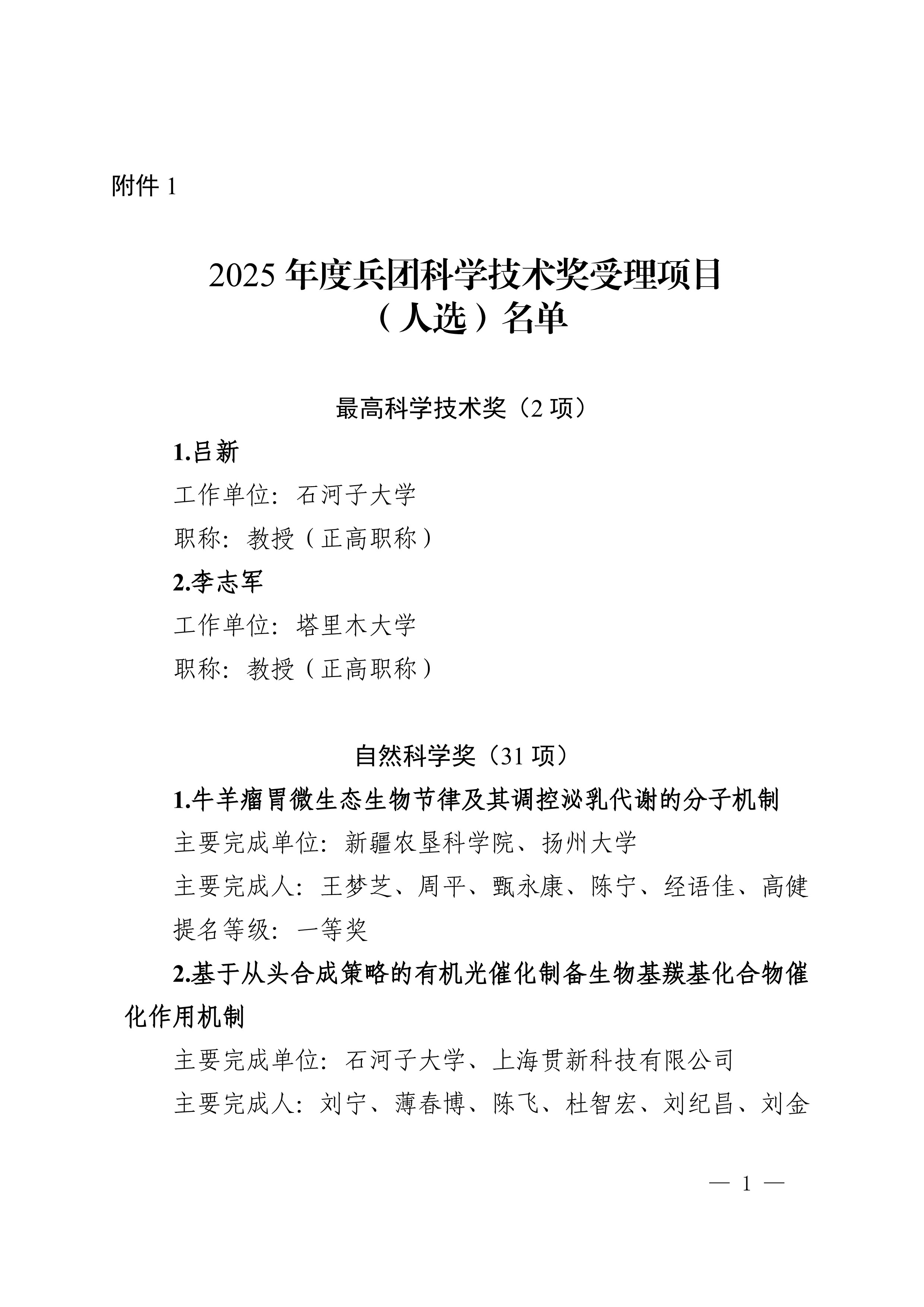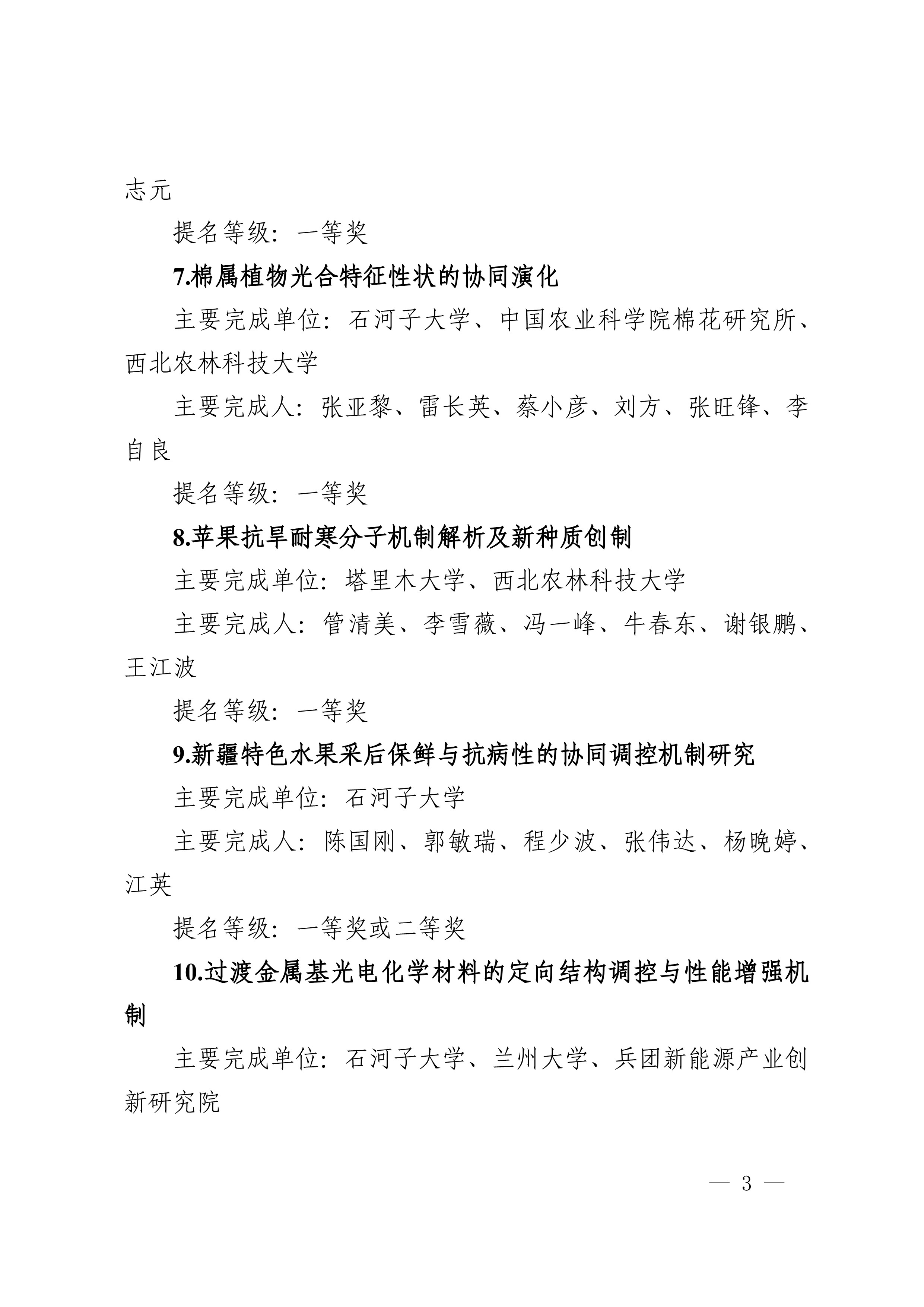 2025年度兵团科学技术奖提名工作已结束,共收到有关单位和专家提名的项目(人选)112项(人)。根据《新疆生产建设兵团科学技术奖励办法》及实施细则有关规定,对形式审查合格予以受理的108项(人)进行公示,其中最高科学技术奖2人、自然科学奖31项、技术发明奖8项、科学技术进步奖67项。