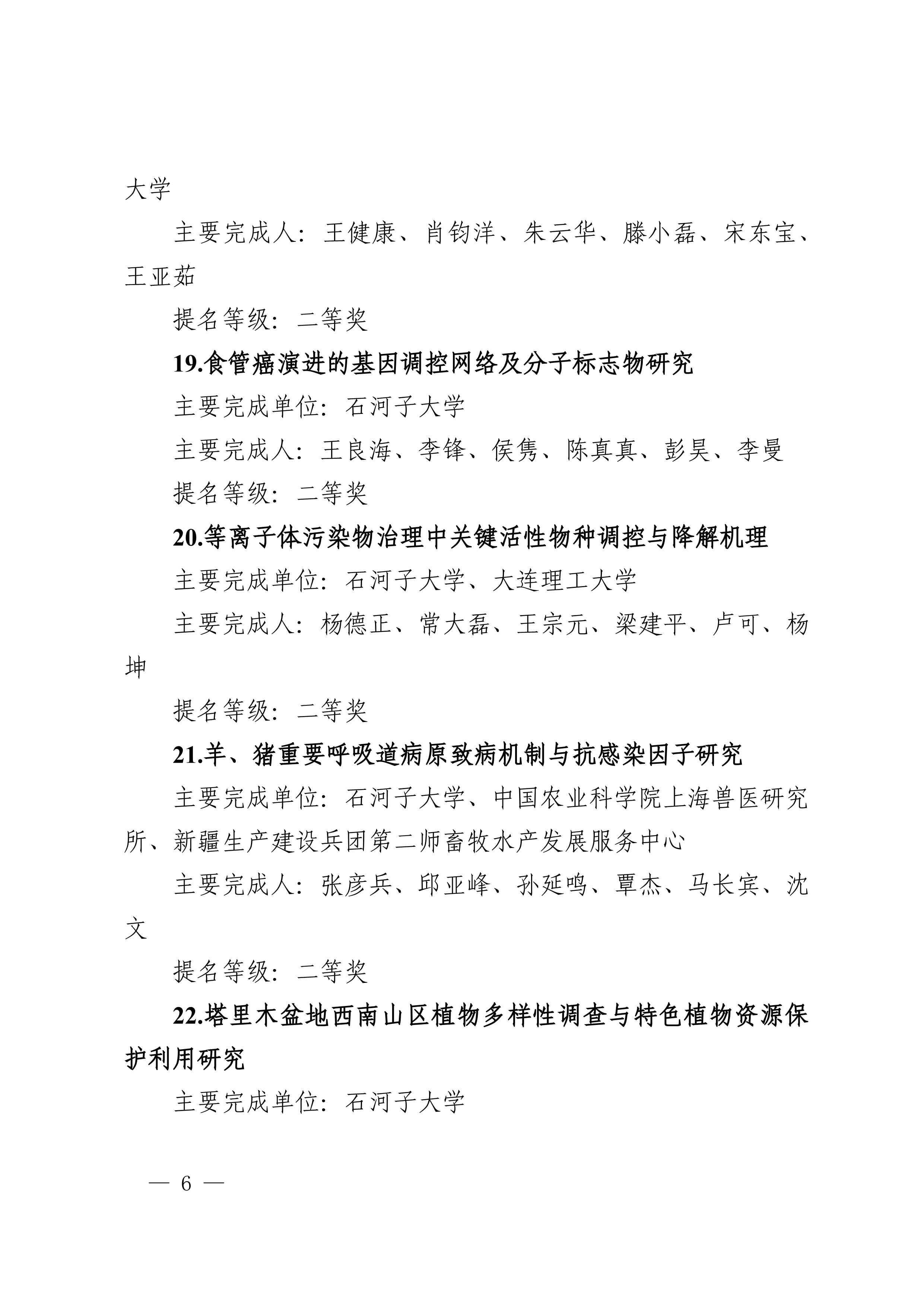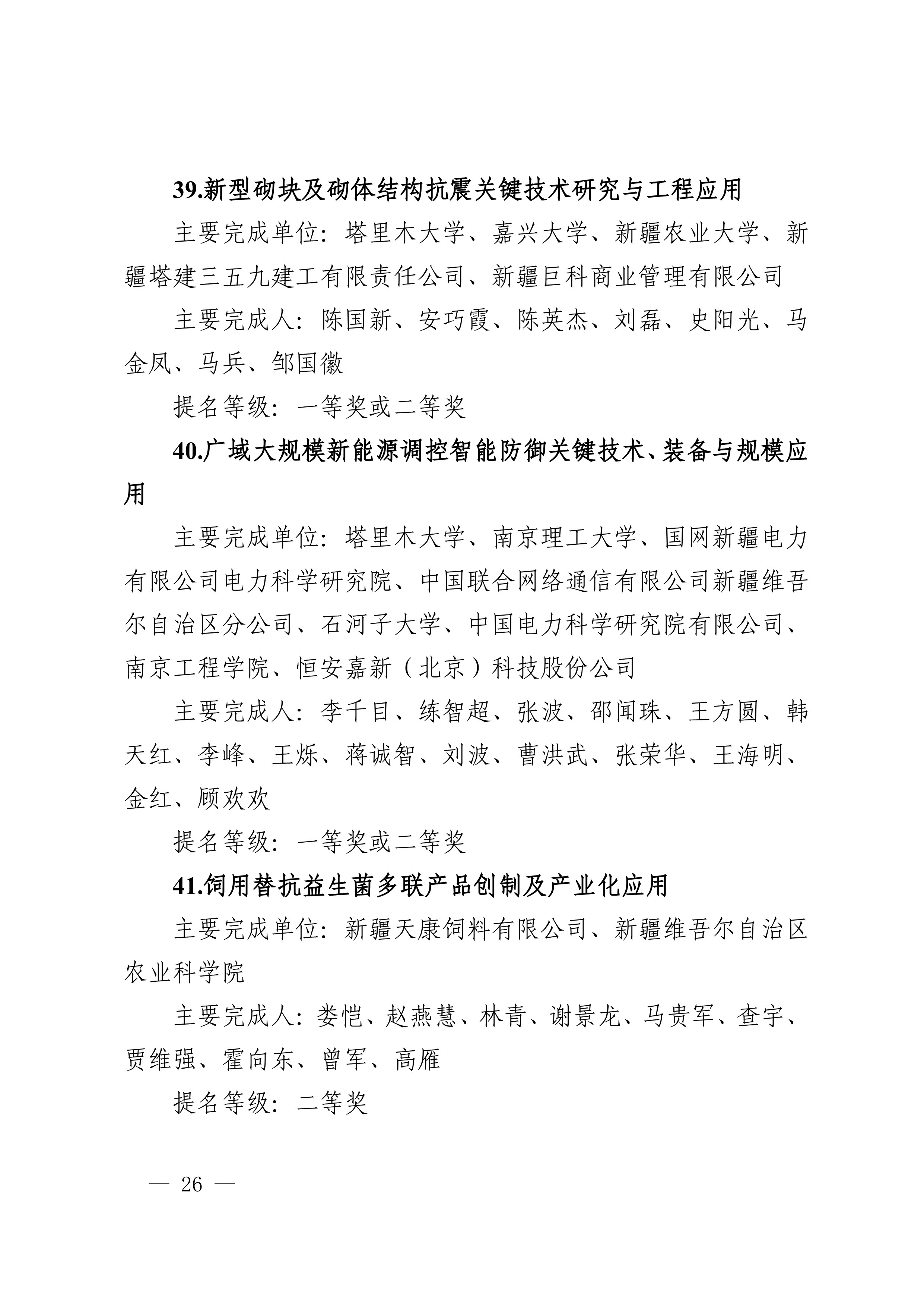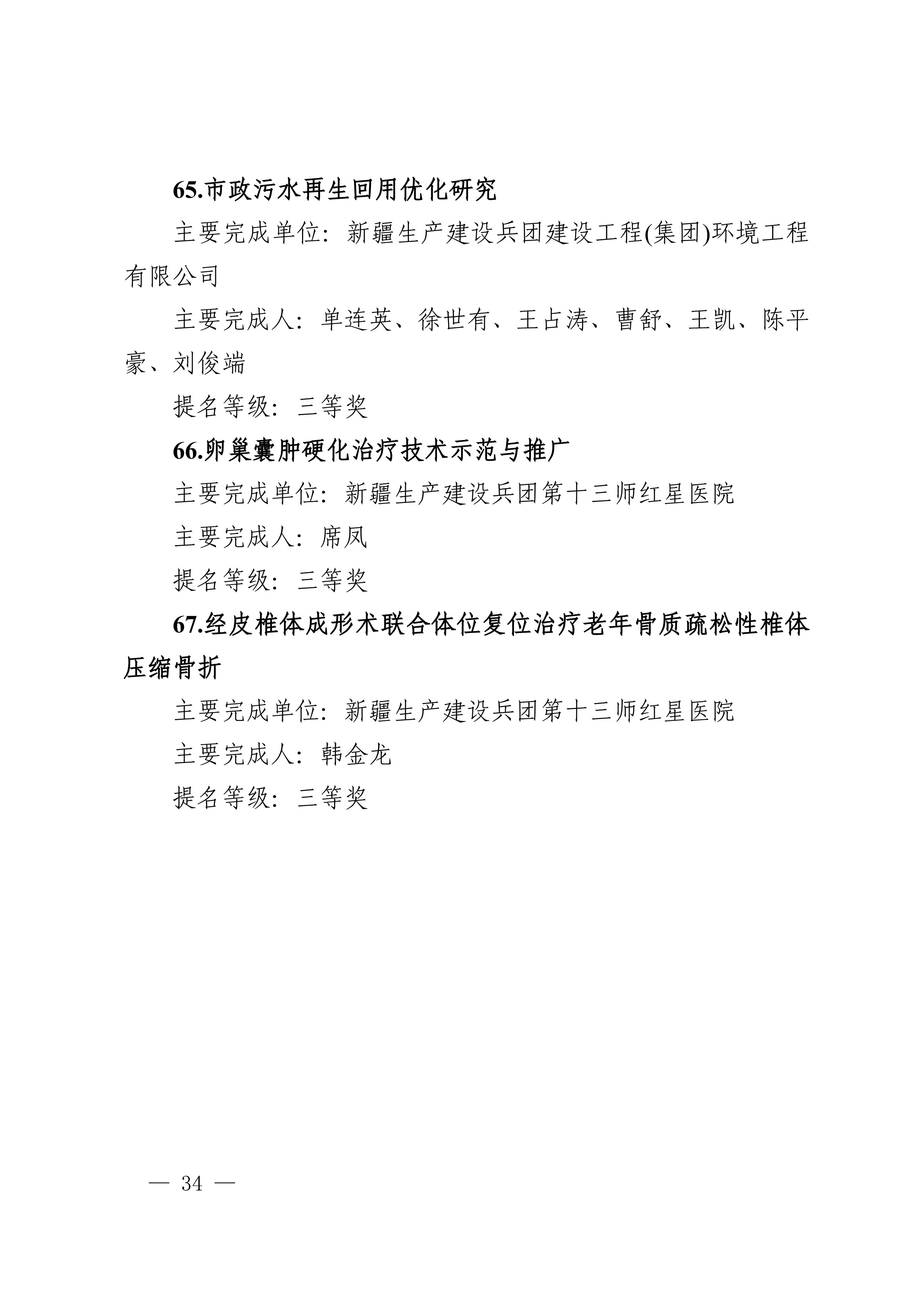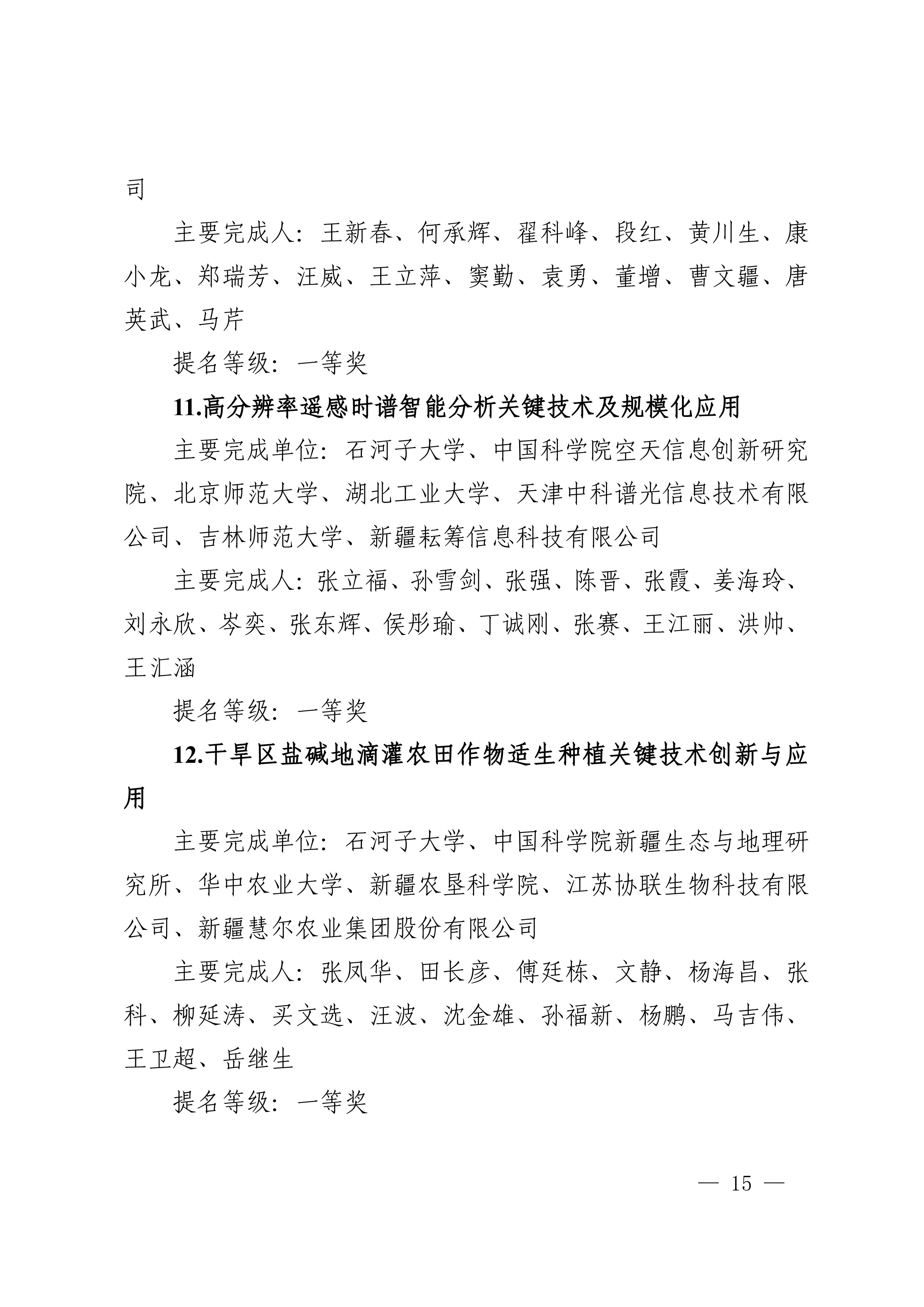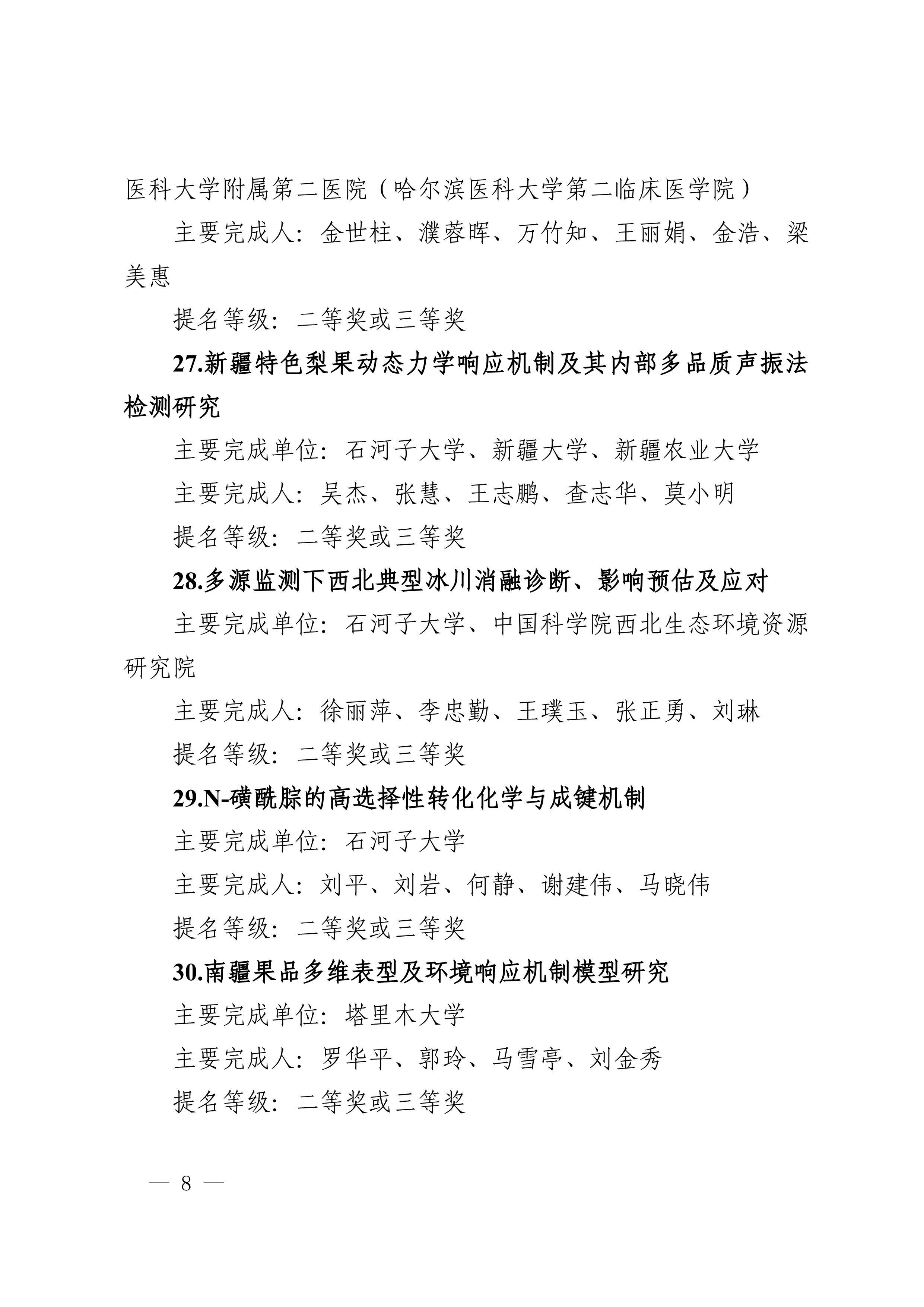 2025年度兵团科学技术奖提名工作已结束,共收到有关单位和专家提名的项目(人选)112项(人)。根据《新疆生产建设兵团科学技术奖励办法》及实施细则有关规定,对形式审查合格予以受理的108项(人)进行公示,其中最高科学技术奖2人、自然科学奖31项、技术发明奖8项、科学技术进步奖67项。