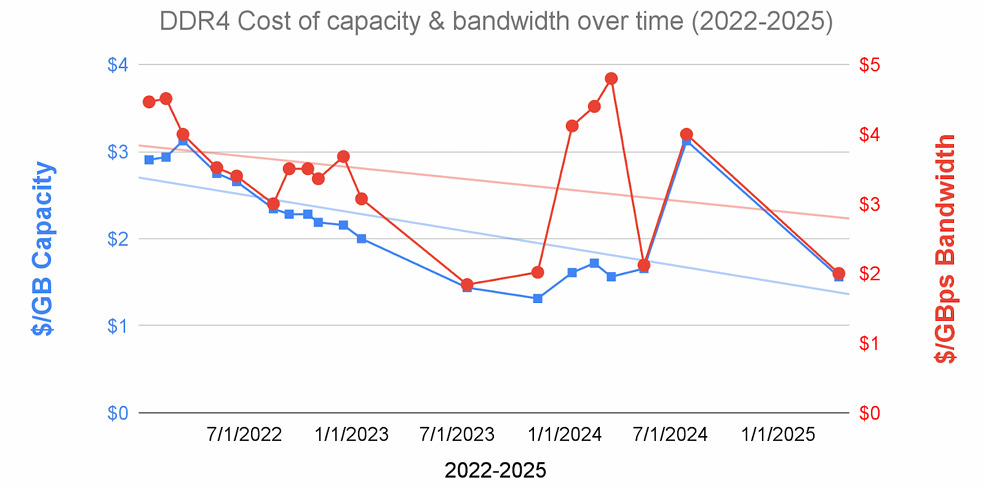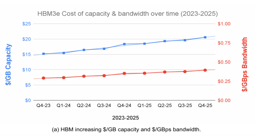 更麻烦的是,HBM 的成本不降反升。论文援引花旗银行的研究数据指出,从 2023 年到 2025 年,HBM 的单位容量成本(/GB)和单位带宽成本(/GBps)都上涨了约 35%。这与传统 DDR DRAM 形成了鲜明对比,后者的成本在同期下降了近一半。