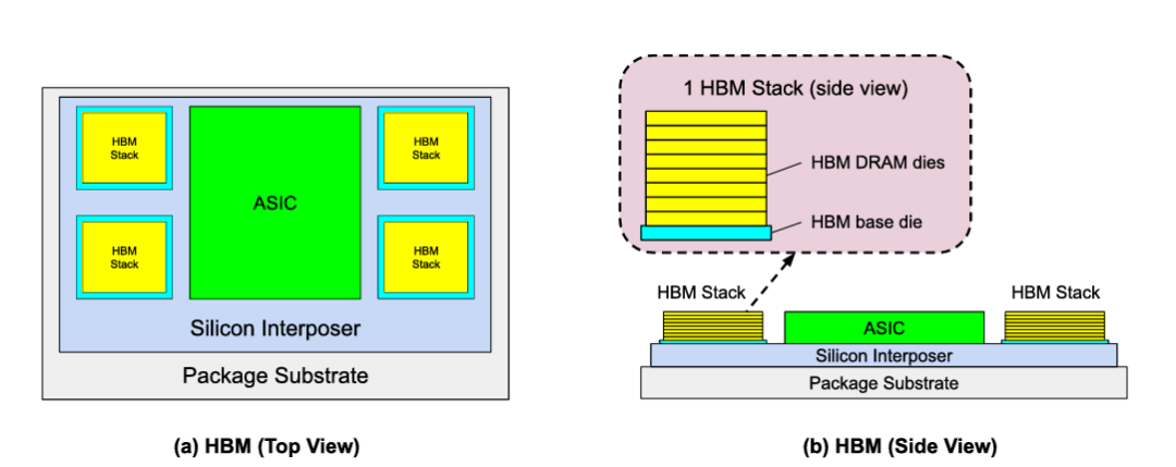 图 | (a) 高带宽内存 HBM 封装俯视图,(b) HBM 侧视图(来源:论文)