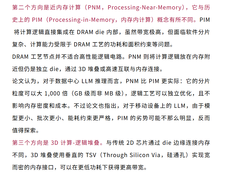 这个方向有两种实现路径:一种是在 HBM 的 base die 上集成计算逻辑,复用现有 HBM 设计,带宽与 HBM 相当但功耗降低 2 到 3 倍;另一种是定制化 3D 方案,通过更宽更密的接口和更先进的封装技术,实现超越 HBM 的带宽和效率。挑战在于散热:3D 结构的表面积更小,散热更难,以及需要建立内存-逻辑接口的行业标准。