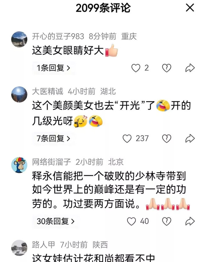 网友们的评论也是五花八门。有的调侃说“这美女眼睛可真大,是不是也去‘开光’了?”也有人替他说话,说他毕竟把少林寺这块牌子推向了全世界,功劳不小。