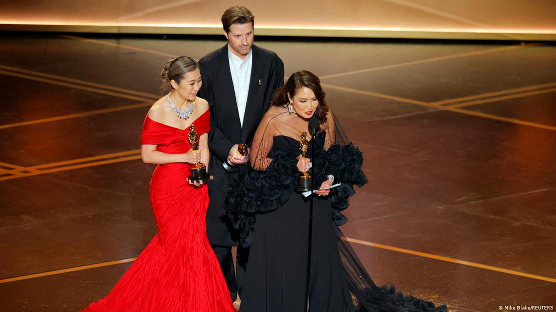《Kpop猎魔女团》夺得最佳动画长片奖与最佳原创歌曲奖,导演兼编剧玛姬姜上台领奖。图像来源: Mike Blake/REUTERS