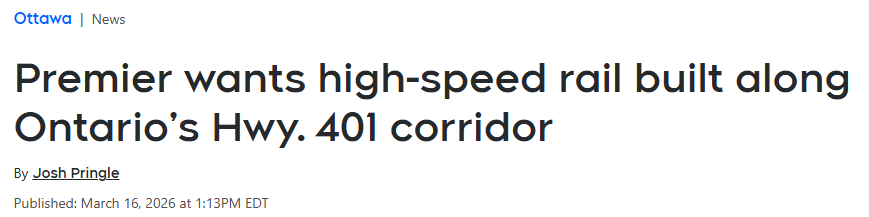 他补充说:“不要去征用农民土地或者其他土地,就沿着401走廊走,这很合理。也可以在金斯顿设一站,因为那边其他线路的停靠站太偏向边界。他们已经有几站,但我们在安省还需要几个停靠站。”