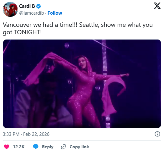 Cardi B在温哥华演出后,在社交媒体上写道:“我们玩得太嗨了!!!”,并附上当晚精彩瞬间的视频回顾。
