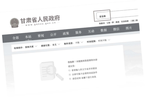 3月13日,甘肃政府官网的“省政府领导”一栏中,其“个人活动”报道列表已经被清空。在搜索栏搜索“雷思维”的名字,结果返回“很抱歉!未能搜到您想要的内容”。这与其他省政府官员不同。