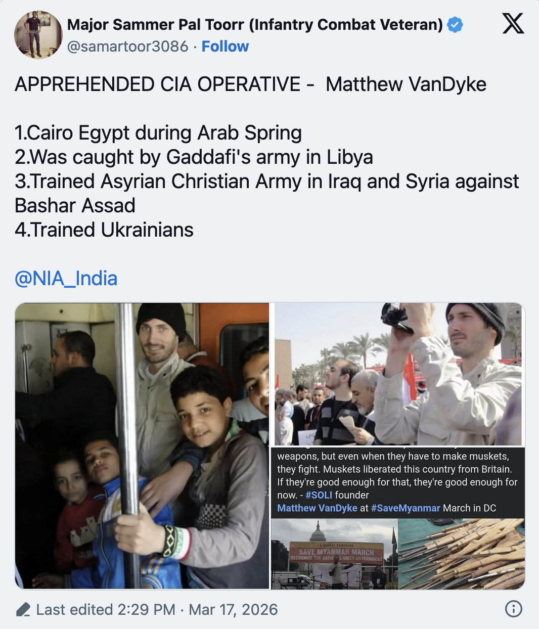 印度国家调查局(NIA)17日宣布破获一起跨国训练武装团体案件,其中一名被捕的美籍人士身分备受关注,根据NIA调查,被捕的7名外籍人士中,包括6名乌克兰公民与1名美国公民,其中这位美籍人士范戴克(MatthewVanDyke)的背景曝光,足迹遍布利比亚、叙利亚、乌克兰、委内瑞拉以及本次曝光的印度及缅甸。