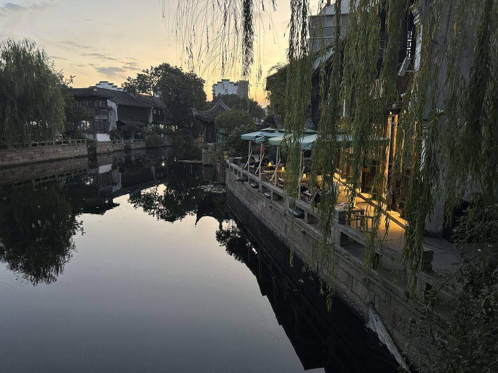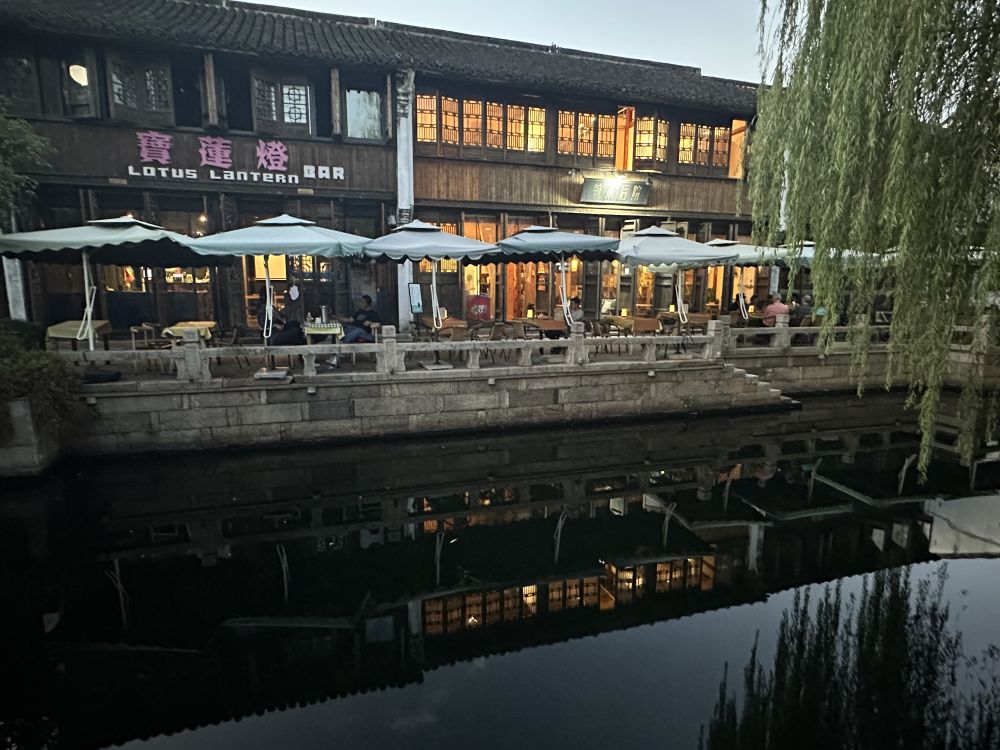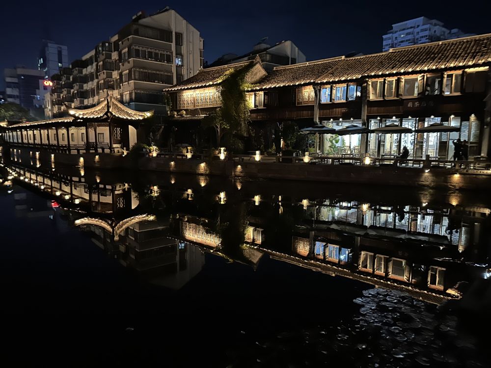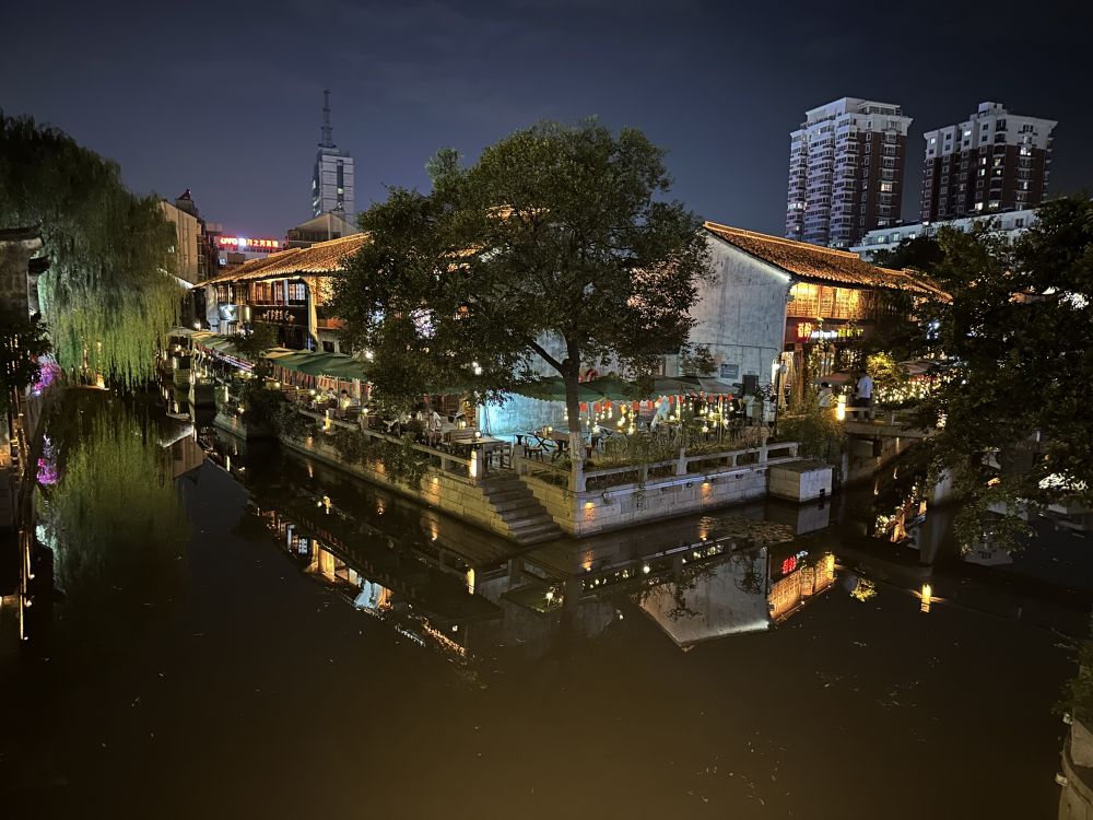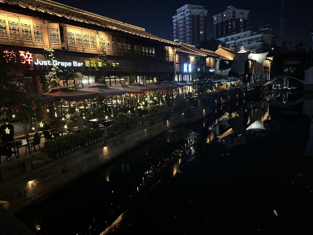 夜幕降临,沿河的灯笼点亮,倒映在运河水面上,酒吧街和临水餐厅也渐渐热闹起来。
