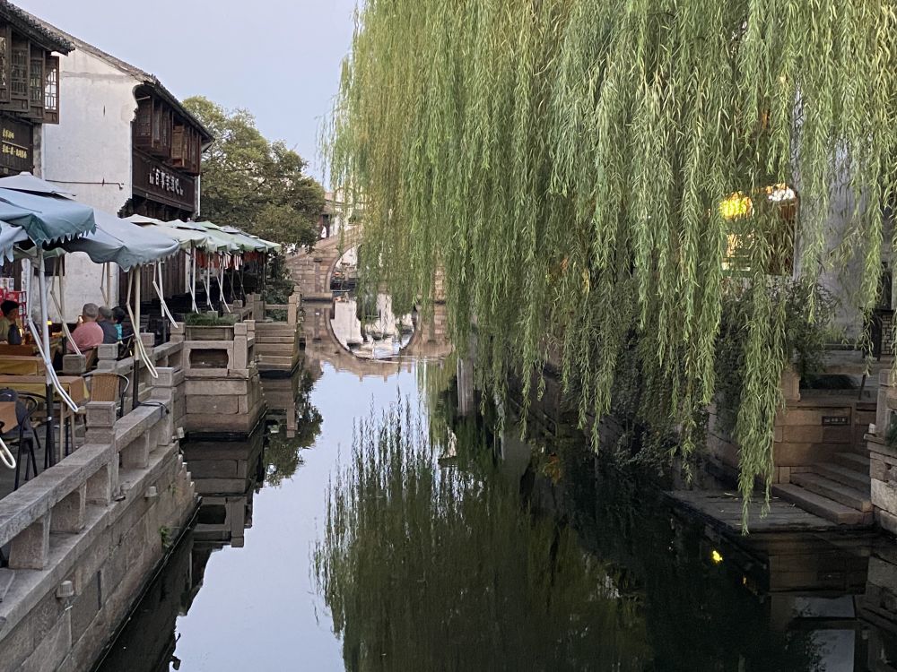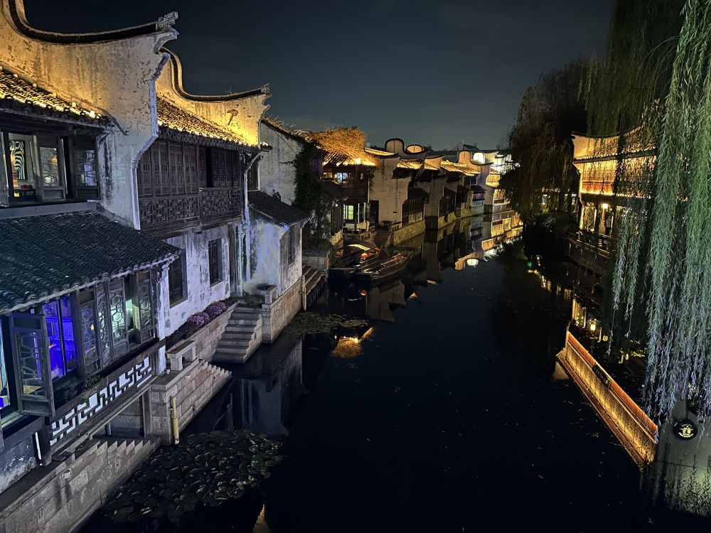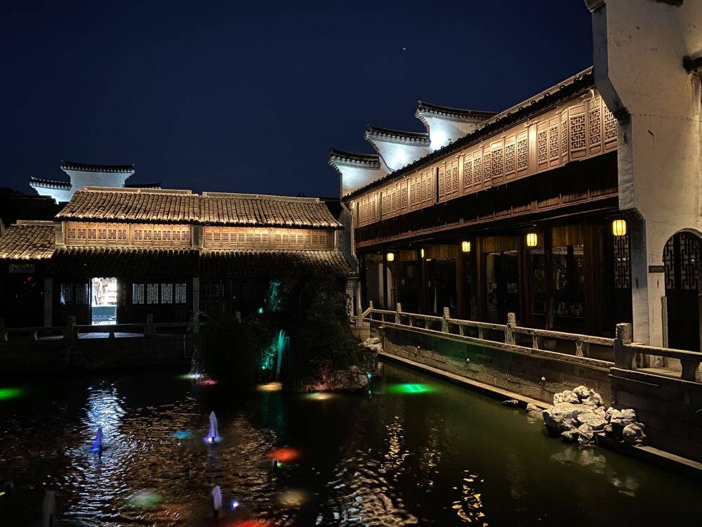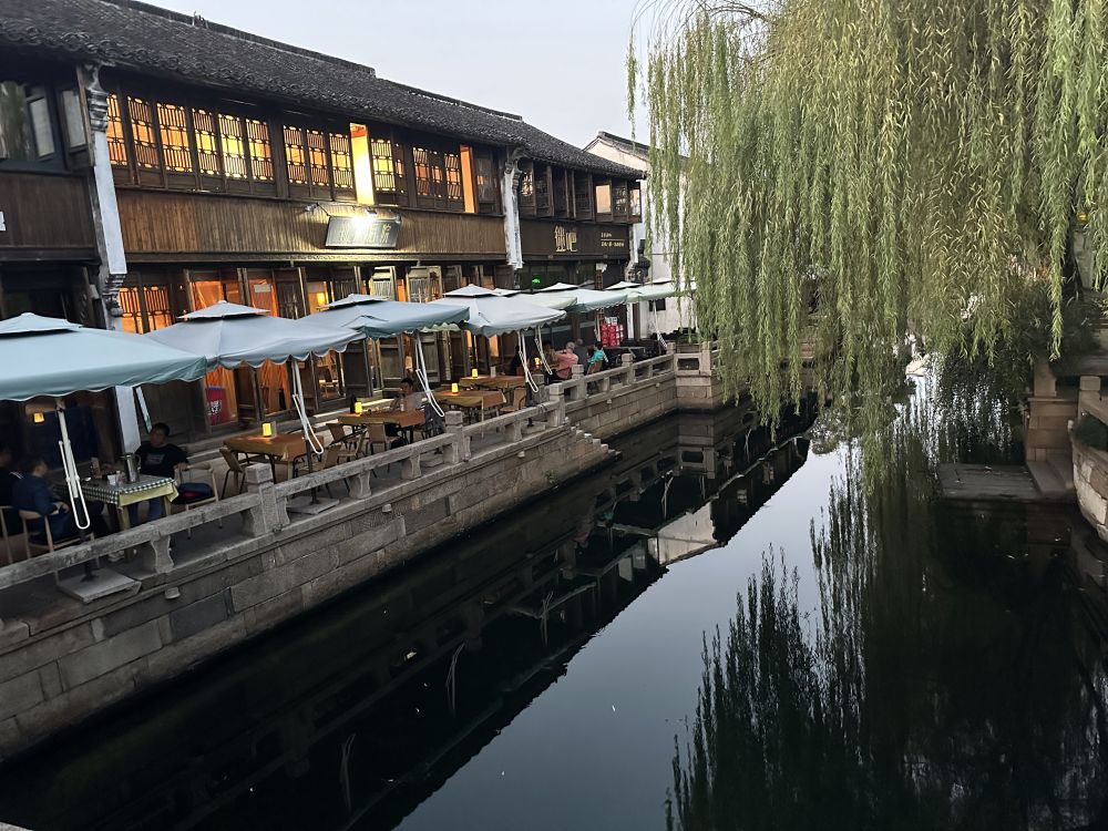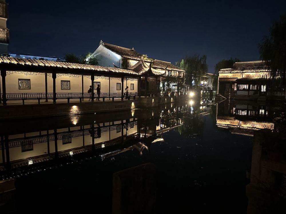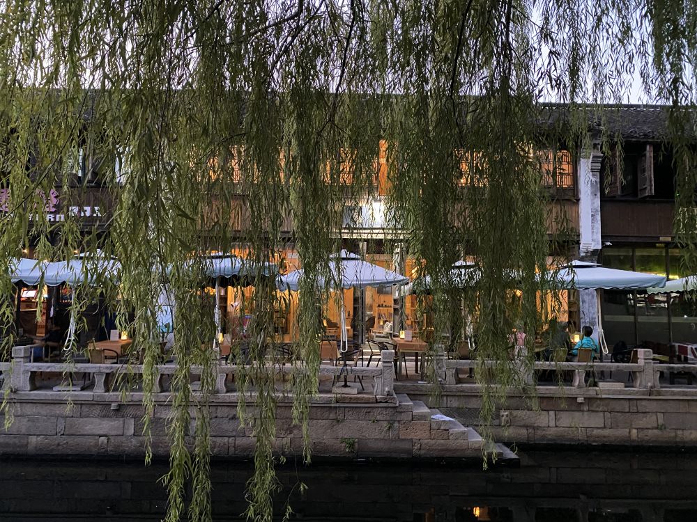 夜幕降临,沿河的灯笼点亮,倒映在运河水面上,酒吧街和临水餐厅也渐渐热闹起来。