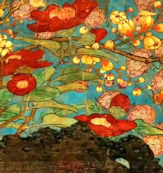 画里的花,个个都是“吉祥物”。梅花是“岁寒三友”,山茶谐音“善财”,水仙寓意“仙人”,长春花象征“长寿”。赵昌把这些花堆在一起,像在玩“新年祝福叠叠乐”——福气、财运、长寿,全给你安排上!连坡地上的野菊,都像在说:“别看我小,我也是来凑热闹的!”