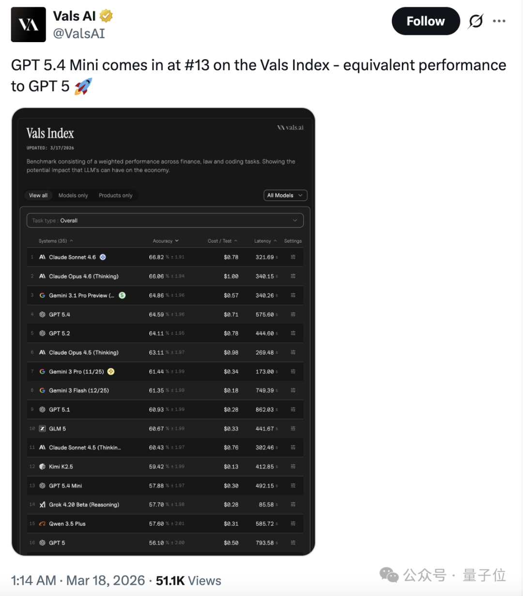 根据公开的大语言模型评测基准Vals,今天新出的GPT-5.4 mini仅排行第13名,优于OpenAI半年前发布的GPT-5。