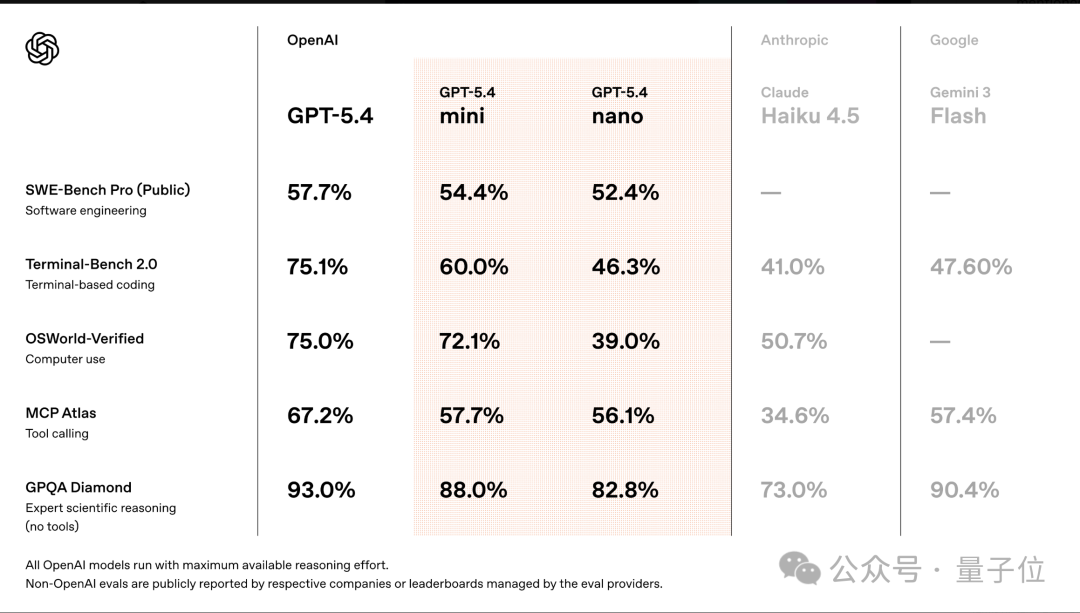值得注意的是,在多个评测中,mini/nano模型与满血版GPT?5.4的差距已经不大,性能上也基本与谷歌,Anthropic的轻量模型持平。
