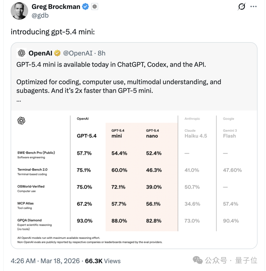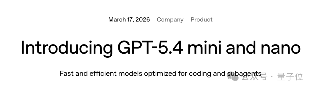 今天,OpenAI推出主打快速和经济的GPT-5.4 mini和nano模型,专门针对编程、计算机操作、多模态理解以及子代理(subagent)做了优化。