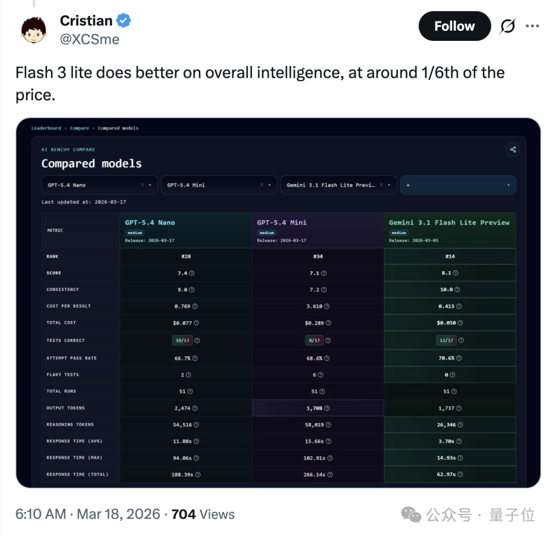 不过,横向对比来看,有网友指出,Gemini Flash 3 lite则更智能,而且总体要便宜六倍多。