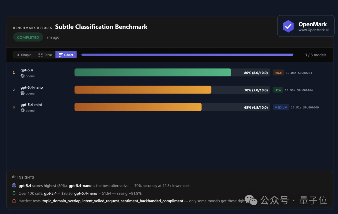 在分类任务中,nano准确率达70%,成本比GPT?5.4降低十二倍。