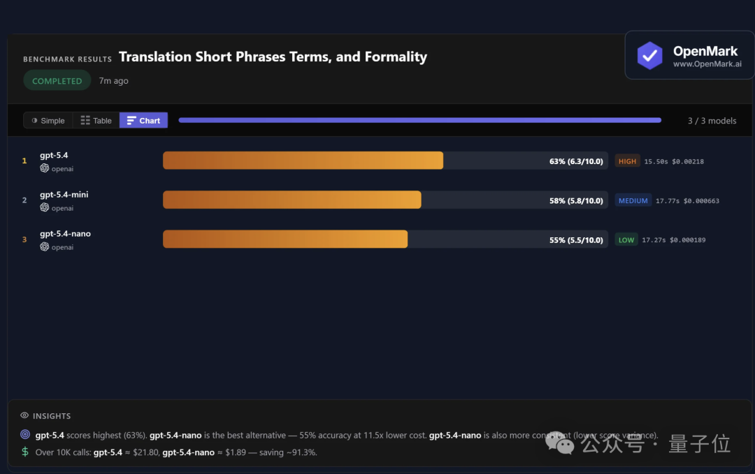 在翻译任务上,nano得分略低,为55分,但与GPT?5.4的63分差距不大,仍可作为替代选择。在超万次调用后,节省幅度仍达到了91.3%!
