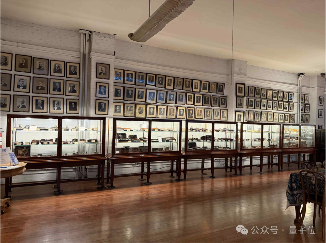 图片显示了一间博物馆展厅的内部,有一面长长的展墙。白色砖墙上整齐排列着许多装框肖像画。肖像画下方是多个玻璃展示柜,木框深色,顶部/前方为玻璃,展示柜内摆放着各种历史文物和设备。房间铺设了抛光木地板,吊顶上有悬挂灯具及电线,墙顶附近可见少量管道。前景中,沿房间长度排列的玻璃柜映出了其他展区的物品。