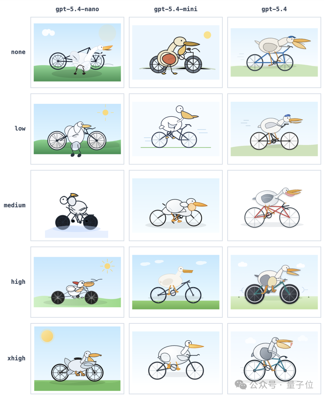即便在创意任务上,如生成鹈鹕骑自行车的SVG图,nano和mini与满血版GPT?5.4仍有一定差距,但它们完成基础创作任务完全可行。
