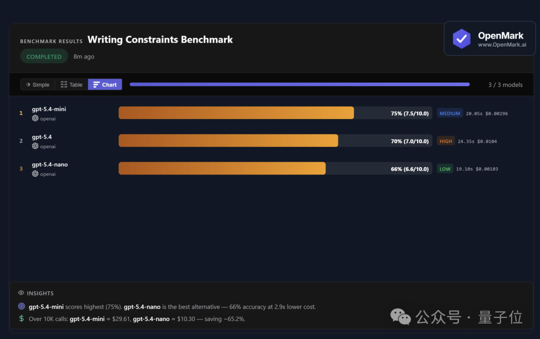 在写作任务中,mini版本反倒得分最高,成本比满血版低约六成。在超过1万次调用时,mini花费29.61美金,nano仅花费10.30美金。