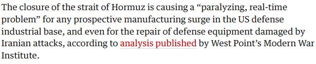 英国《卫报》对此的解读更为直白,认为西点军校的分析意味着,霍尔木兹海峡的关闭,对美国国防工业产能提升及受损装备修复造成了“瘫痪性、即时性冲击”。