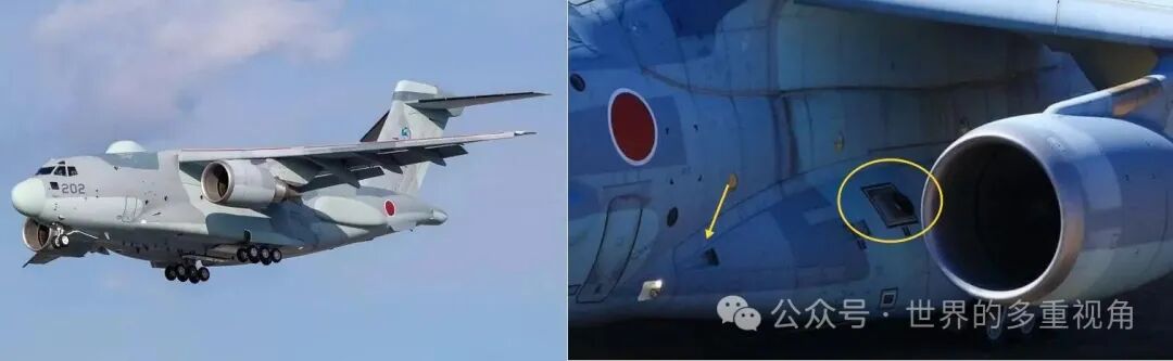 相比运输型 C-2,EC-2 在左侧多了一个进气口和排气口,里面应该是内置的发电机。这说明电子设备功率太大,仅靠飞机自身发动机的发电量难以满足。