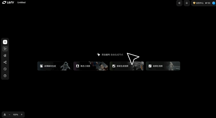 具体来看,打开 LibTV 官网点击 “开始创作”,迎面而来的并非传统 AI 创作界面,而是一块可以无限延伸的画布。