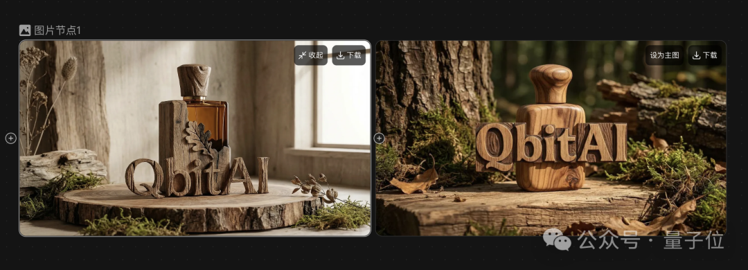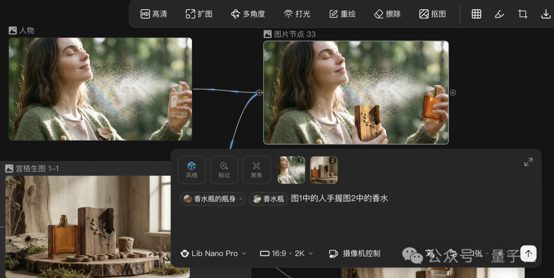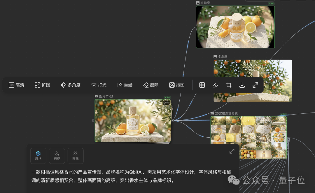 例如在前面生成的香水图后再拉出一个图片节点,按下 “/”,选择生成剧情推演四宫格。