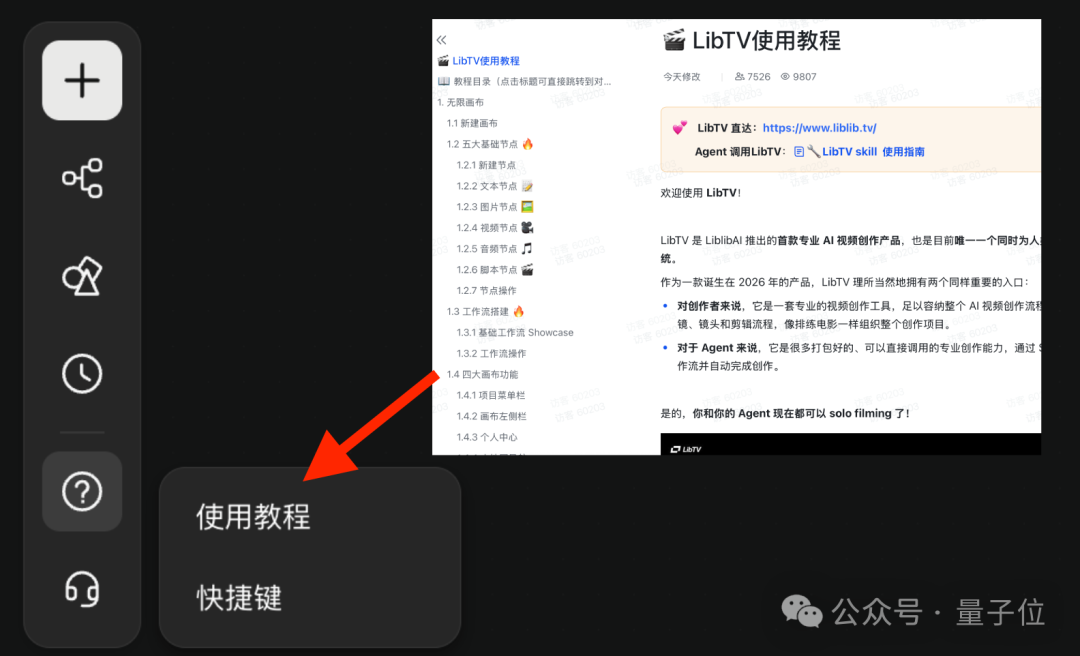 顺便提一嘴,LibTV 的功能玩法其实还有很多,官方也出了详细的使用教程,入口就在画布左侧的工具栏: