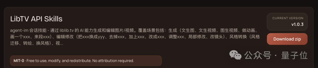 第二个方法是到 ClawHub 平台的 LibTV API Skills 页面,拿到 Skill 文件后解压到对应目录,即可调用: