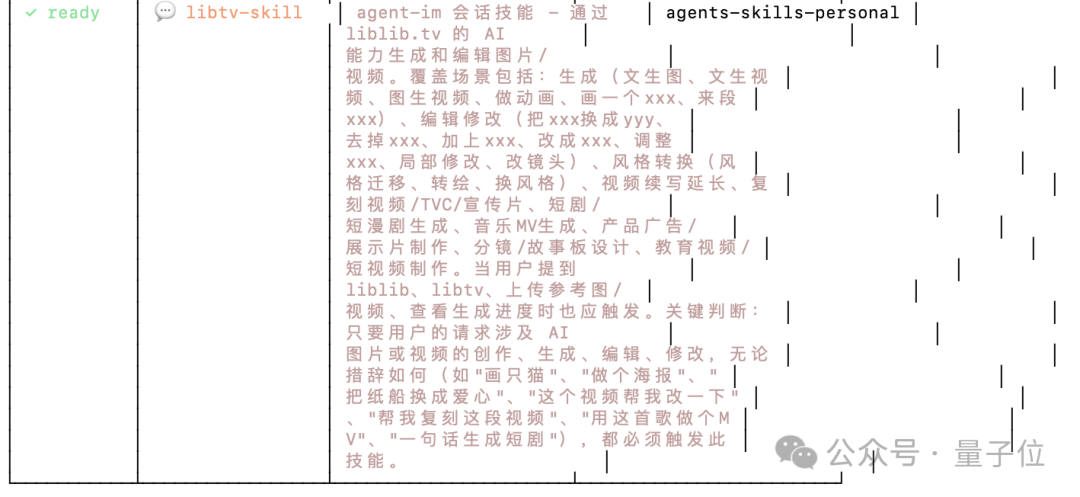 操作完成之后,可以通过 openclaw skills list 命令检查一下,Skill 列表中出现 LibTV 就代表安装成功: