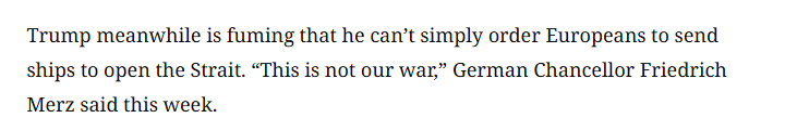 文章称,海湾国家连续数天遭遇导弹和无人机警报,而这一威胁源于他们的盟友美国发动的一场他们并不希望发生的战争。与此同时,美国总统川普因多次催促欧洲国家参与霍尔木兹海峡护航行动未果而大为恼火。但欧洲的态度仍然没有实质性改变。本周早些时候,德国总理默茨表示:“这不是我们的战争。”