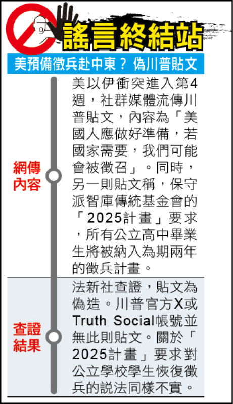 查证结果:不实。 法新社查证,宣称来自川普的贴文为伪造。 川普的官方X或Truth Social帐号并无此则贴文。 关于2025计划要求对公立学校学生恢复征兵的说法同样不实。