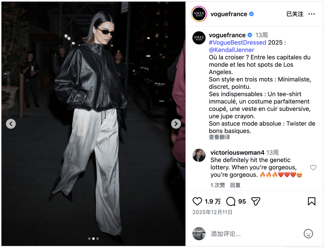 法版Vogue把她评为2025“下班后”(off-duty)最佳穿搭人物之一。▼
