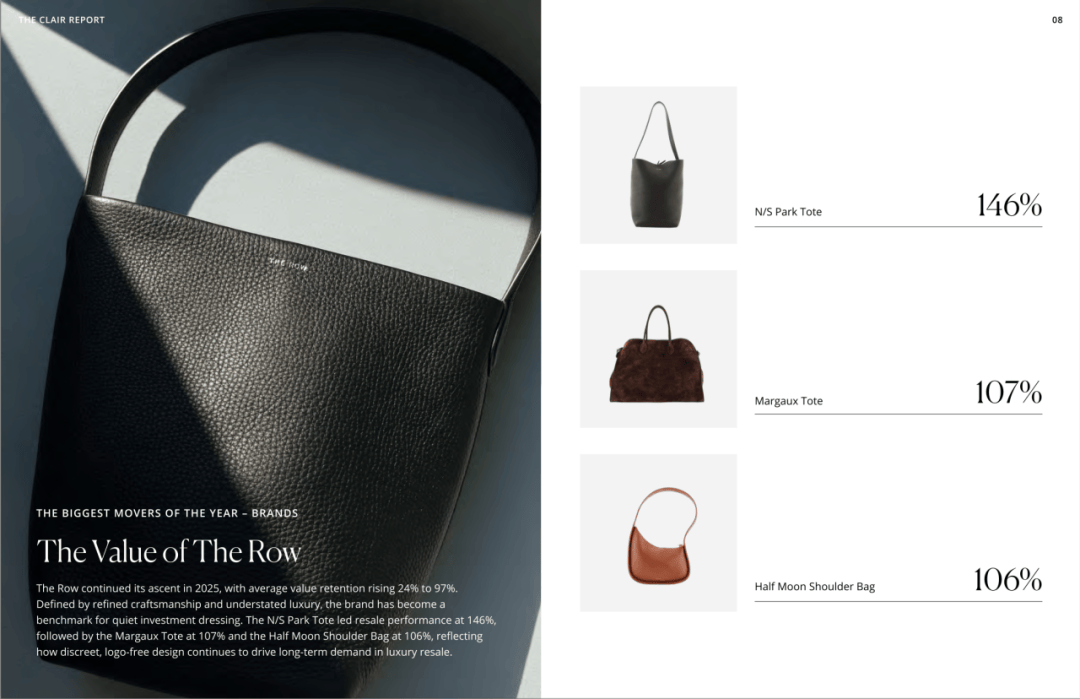 时尚机构Rebag在2025年大牌包保值率研究里提出,The Row的包包成绩相当亮眼,仅次于Hermès、Goyard、Telfar。这跟它极简、不易过时的设计有很大的关系。