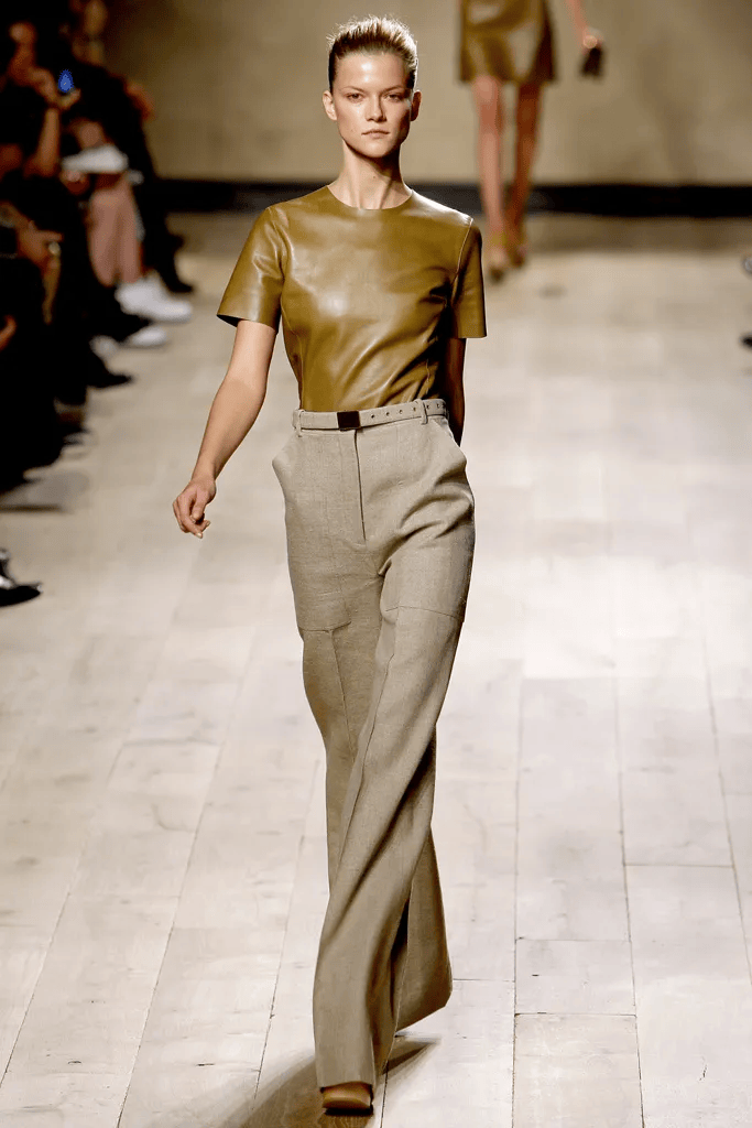 她有一件很有标志性的单品,也是用皮做的——2010年Céline首秀上的那件皮T恤。用柔软轻薄的皮革,剪裁成简单的基础款T恤。▼