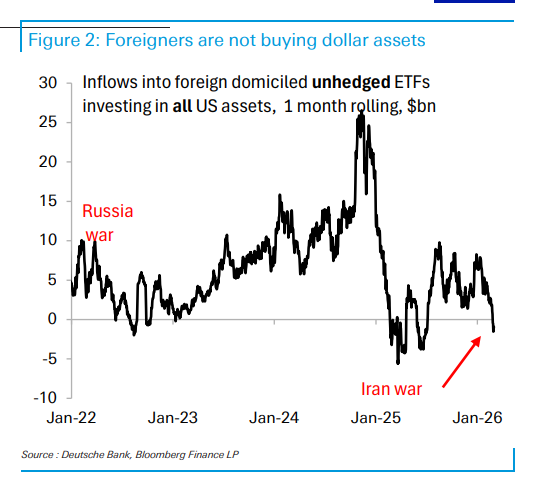 尽管面临能源危机,美元却未能如期大幅走强。德银研报指出,全球资本流动模式正发生巨变:一方面,全球央行集体转鹰削弱了美元的利差优势;另一方面,亚洲和中东国家为应对高昂进口账单和地缘冲突,正消耗美元储备,导致外资停止买入美国资产。传统“石油美元”回流美国的路径受阻,进一步瓦解了美元的强势基础。