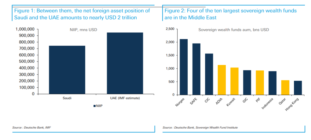 历史上,海湾经济体是全球最大的储蓄者之一。仅阿联酋和沙特两国的净国际投资头寸就接近2万亿美元,全球十大主权财富基金中,有四个位于中东。这些由石油美元积攒下的庞大财富,过去常常回流美国金融市场,支撑着美元霸权。
