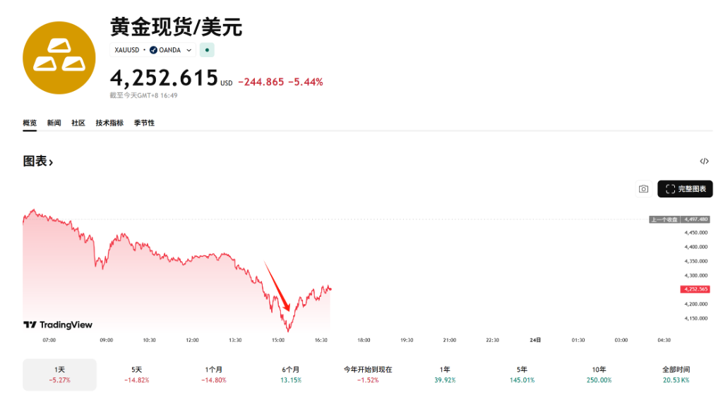 上周国际金价单周暴跌逾11%,创下自1983年3月以来最大单周跌幅,从5000美元上方快速跌至4500美元附近。