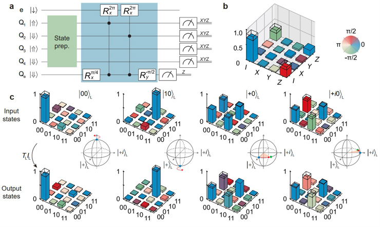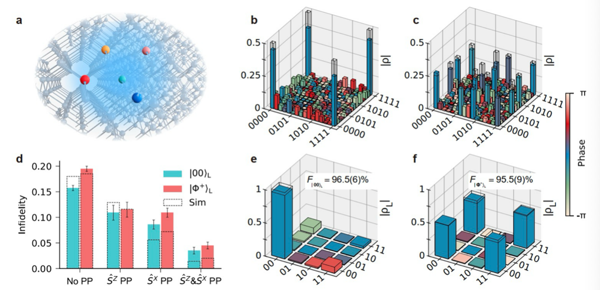 研究团队利用扫描隧道显微镜氢掩膜光刻(STM-HL)技术,以原子级精度加工出硅基量子计算芯片后,在该芯片上研究团队演示了[[4,2,2]]逻辑量子态的容错制备。其中包括逻辑纠缠态,并通过后处理校验显著提升其保真度。此外,团队还进一步成功演示了完整的通用逻辑量子门集。