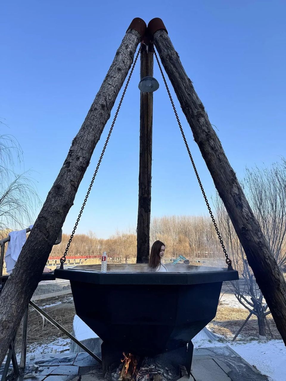 洋气的暴风雨和热带雨林实现了与国际接轨,而本土特色款也是真接地气。比如,某网红洗浴中心的室外泡池区把“铁锅炖自己”都给整上了,巨大的泡缸下是真实燃烧的柴火。冰天雪地的户外,躺在冒着热气儿的铁锅里,欣赏着日落,场景相当抽象。
