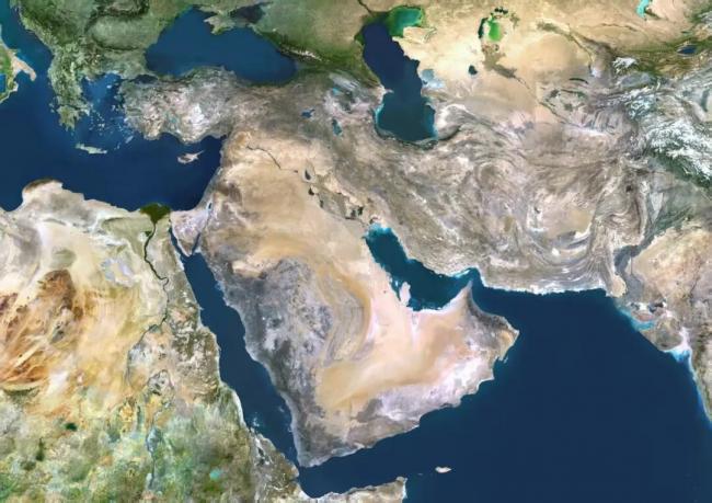 中东地区的彩色卫星影像。图片中央是阿拉伯半岛,半岛右上方的弧形海湾是波斯湾,“人字形”的狭窄海峡是霍尔木兹海峡,这也是波斯湾连通印度洋的唯一海上通道。半岛左下方为红海,霍尔木兹海峡通行受阻后,有部分商船正在考虑从红海绕行,以进入沙特阿拉伯的吉达港(视觉中国 供图)