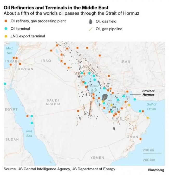 中东炼油厂和储油终端分布图(数据来源:美国中央情报局、美国能源部,彭博社制图)