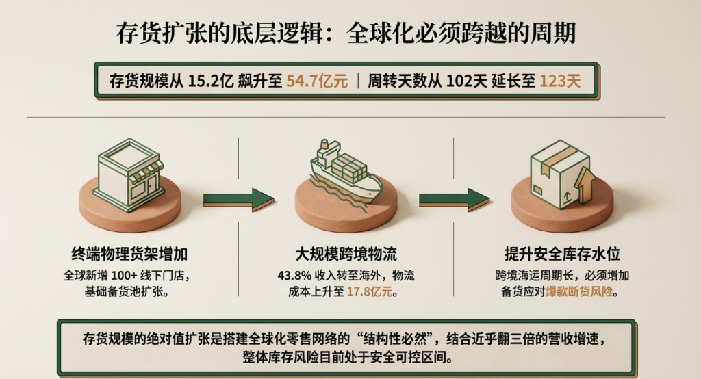 一是海外业务占比提升,跨境货运周期较长,需要维持更高的安全库存;二是全球新增门店超过100家,备货需求相应增加。虽然存货的绝对规模扩张较快,但结合大幅增长的收入规模,匝檀见明显库存风险。